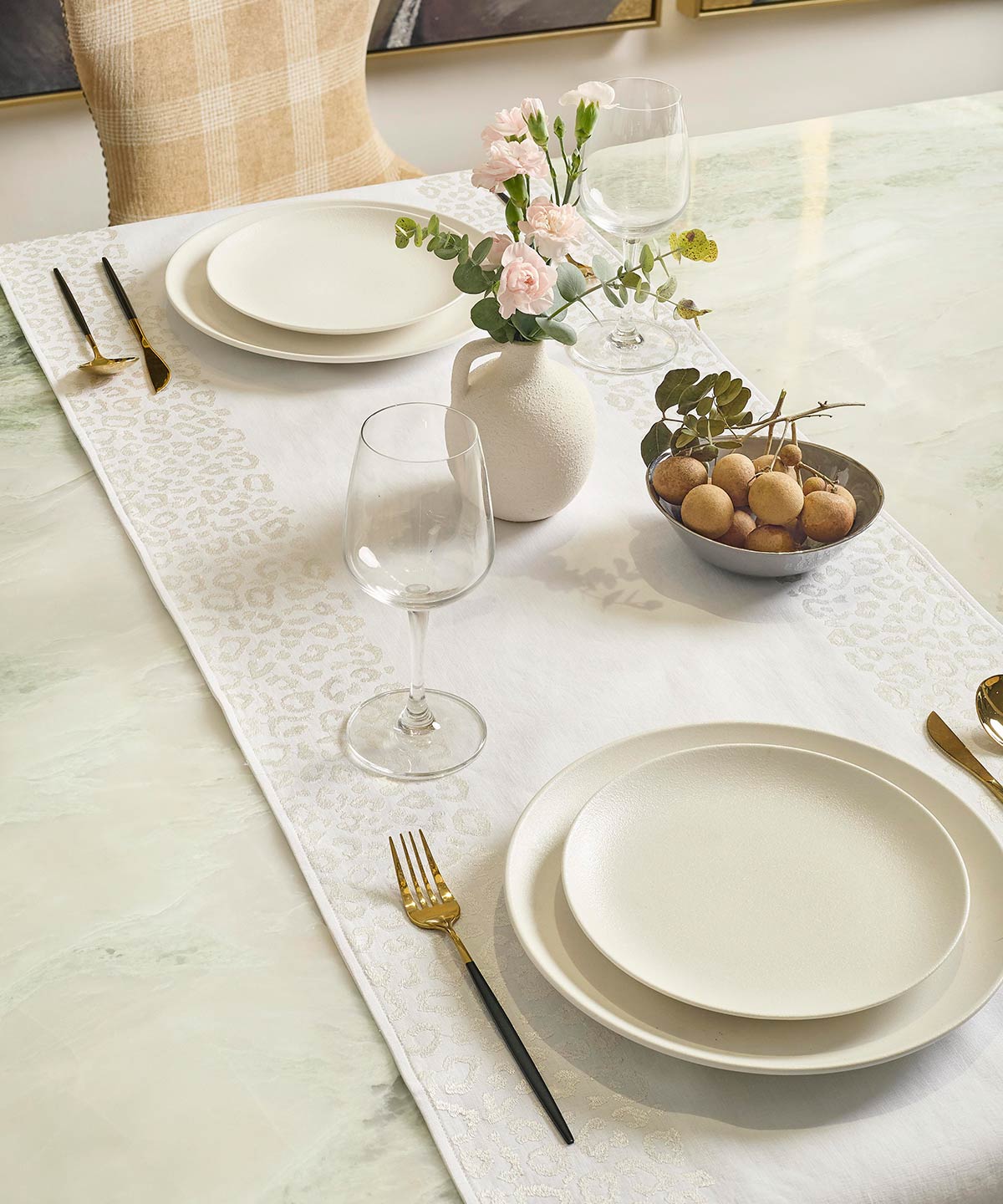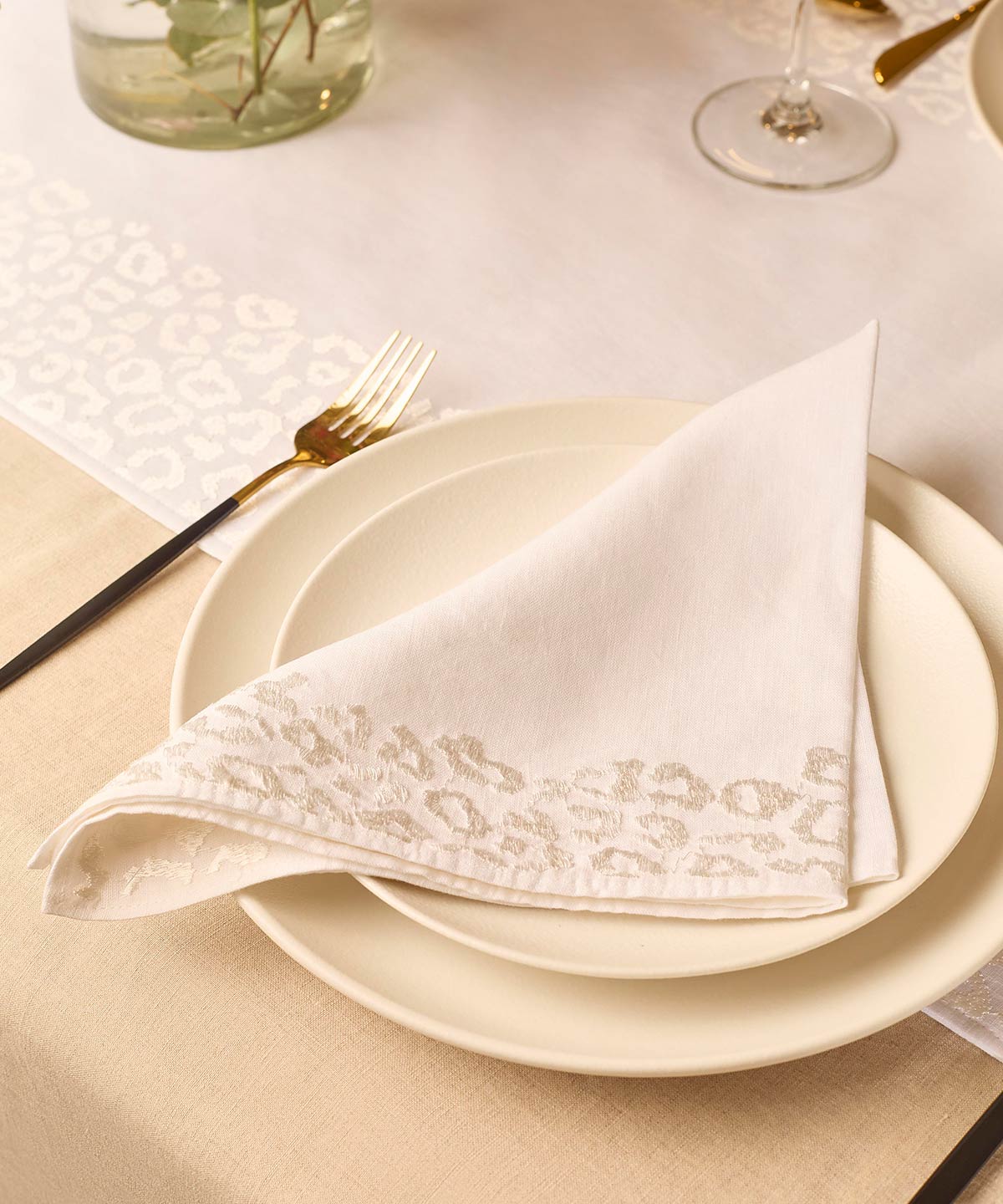 Leo is an elegant and artistic design, ideal for adding a touch of refined charm to gatherings and special moments around the table. Inspired by our iconic Leo motif, this collection creates a subtle yet sophisticated visual rhythm. The Leo pattern is embroidered along the hems of our napkins, table runner and placemats, bringing effortless elegance to every dining occasion.
