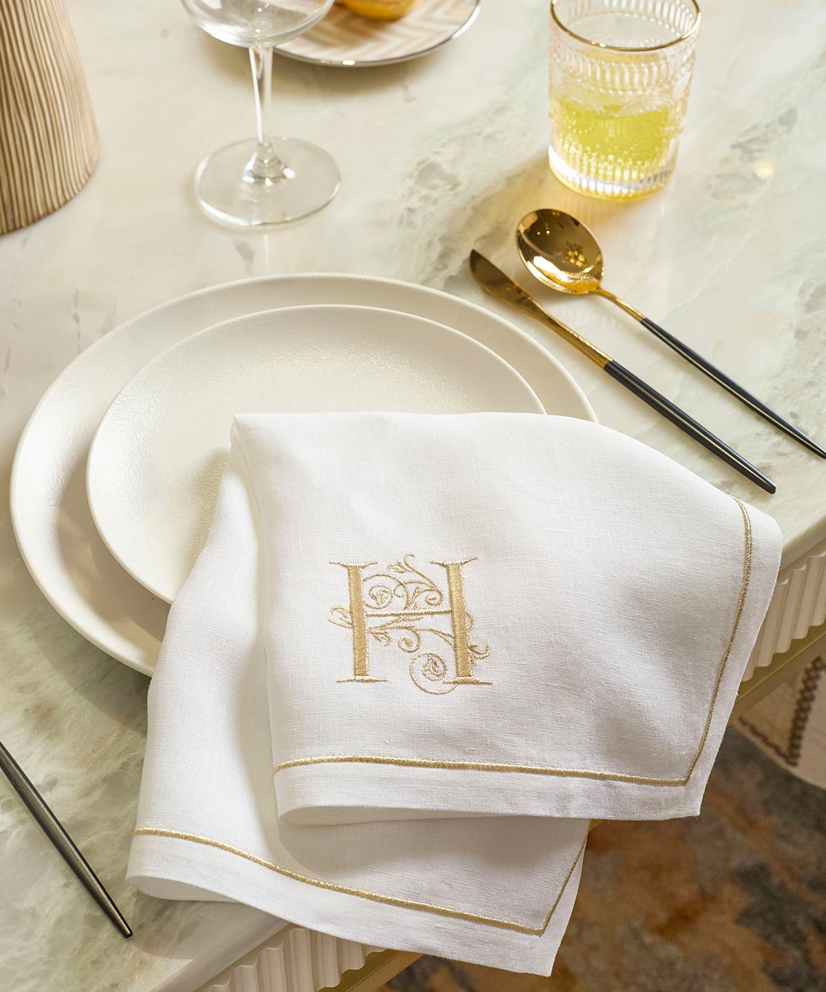 Bộ Sưu Tập Khăn Ăn Thêu Chữ Monogram nâng tầm bàn tiệc của bạn trong mọi dịp đặc biệt, với hình thêu chữ cái đẹp mắt trên nền vải linen màu trắng sang trọng. Hoàn hảo để tạo nên những bộ bàn ăn đặc biệt hoặc làm quà tặng ý nghĩa, những chiếc khăn ăn thêu chữ dễ dàng phối cùng các bộ khăn trải bàn màu trắng của chúng tôi, mang đến vẻ đẹp thanh lịch cho mọi buổi tiệc.